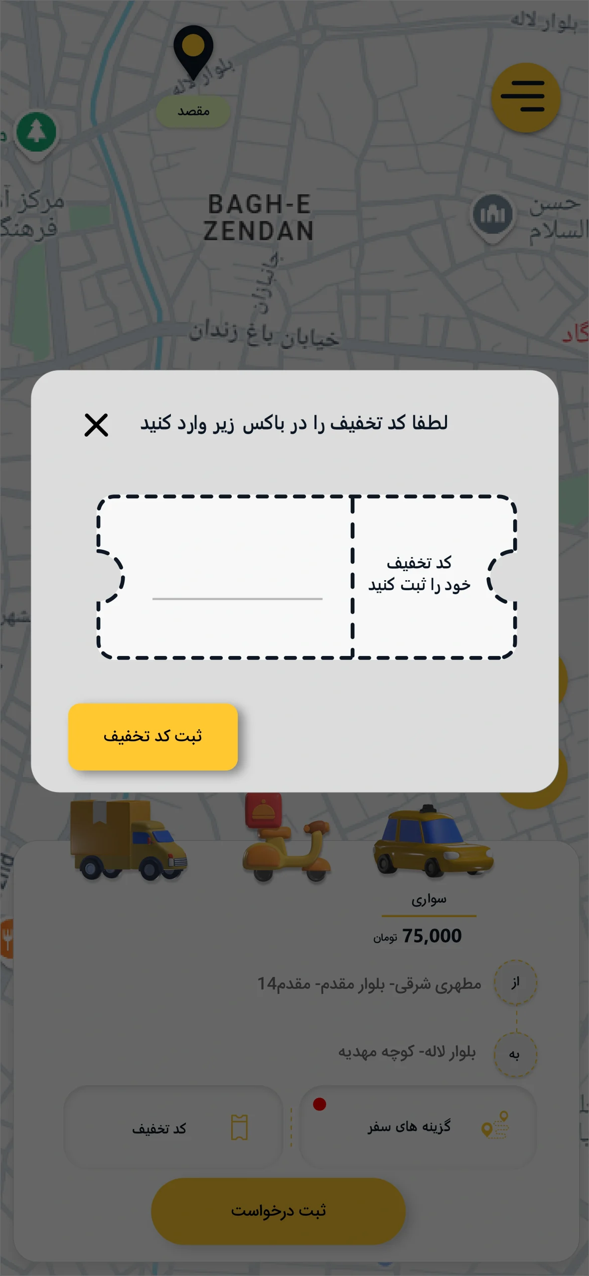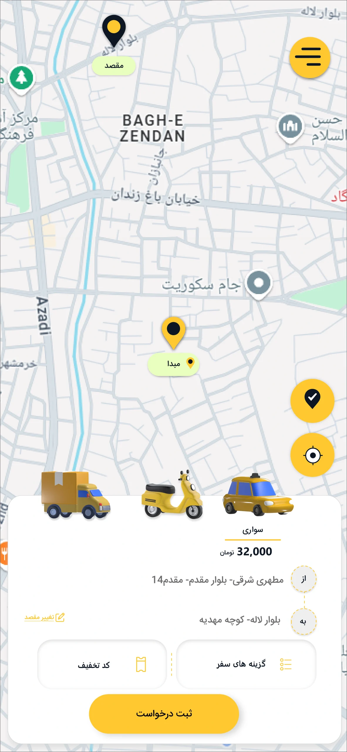 علاوه بر درخواست تاکسی، امکان ارسال بسته و پیک موتوری نیز در اپلیکیشن فراهم شده تا تمام نیازهای حملونقل شما پوشش داده شود.